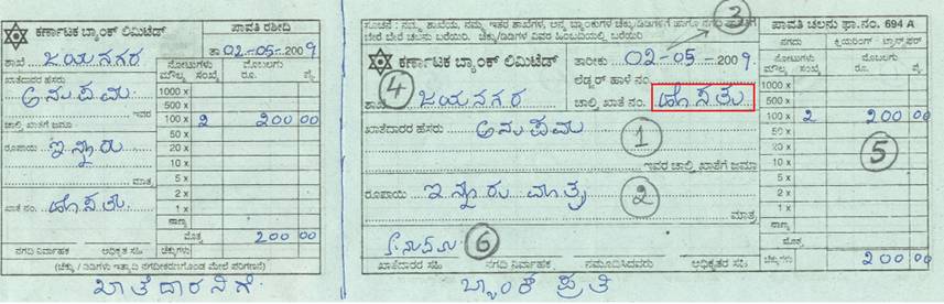 form) ಯಲ್ಲಿ ಬರೆದು ಕೊಡಬೇಕು.ಉದಾಹರಣೆಗೆ ಕರ್ಣಾಟಕ ಬ್ಯಾಂಕ್ ನಲ್ಲಿ “ಹಣ ಪಡೆಯುವ ಹಾಳೆ”ಯಲ್ಲಿ ತುಂಬಿಸಬೇಕಾದ ವಿವರಗಳನ್ನು ಗಮನಿಸುವಾ.